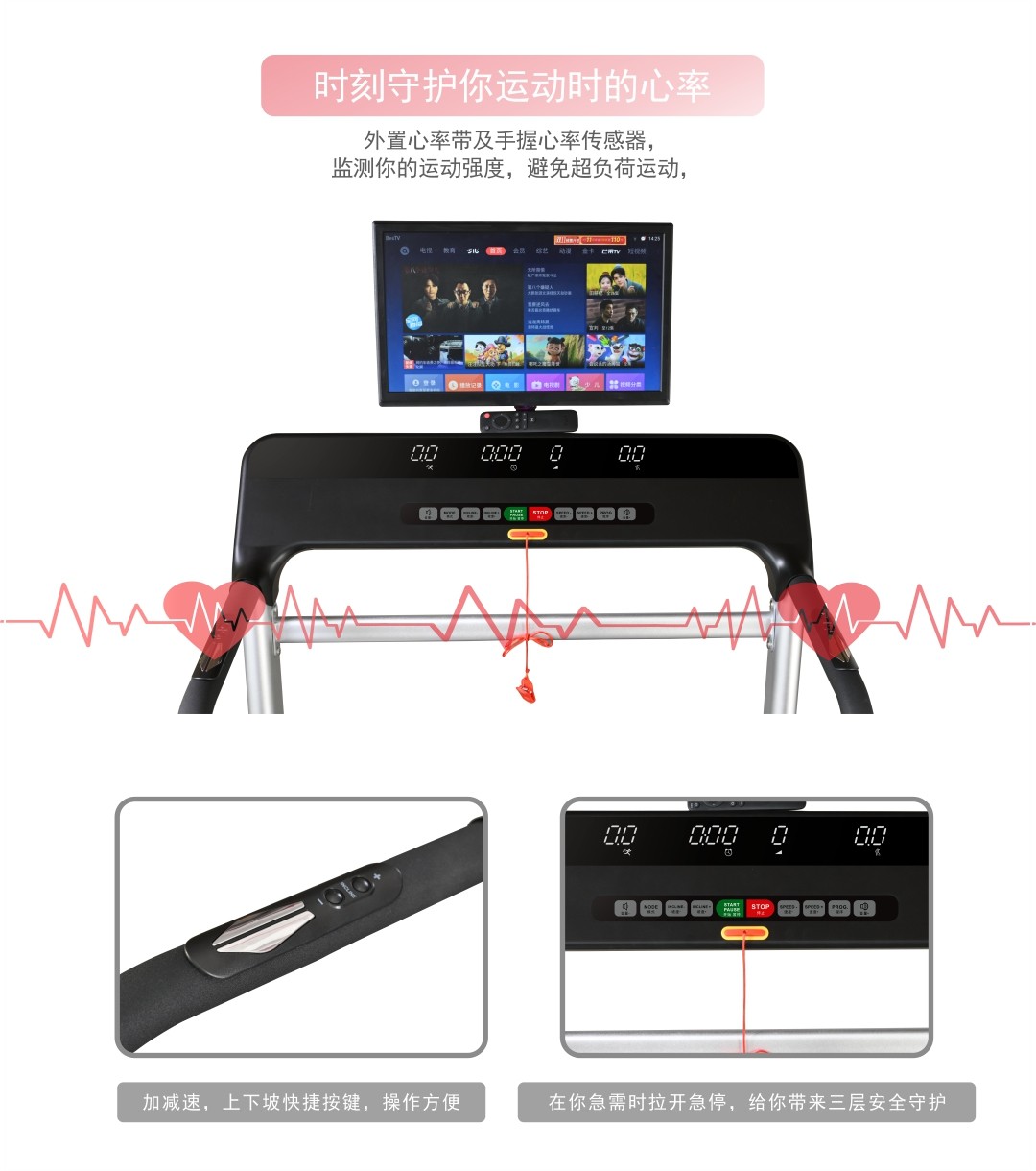 显示参数:时间,速度,距离,卡路里,坡度(正&负坡度),心率,步数;